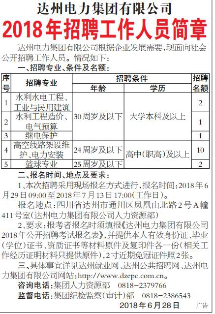 達(dá)州電力集團(tuán)有限公司根據(jù)企業(yè)發(fā)展需要,現(xiàn)面向社會(huì)公開招聘工作人員